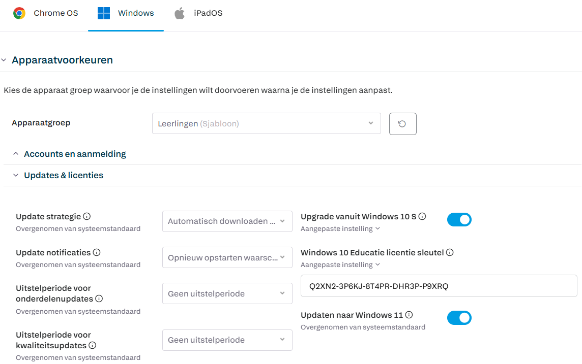 Het updaten naar Windows 11 kan ingesteld worden door een ICT-coƶrdinator in Manage. Het updaten is een globale voorkeur. Je stelt dit dus in voor alle Windowsapparaten tegelijk.