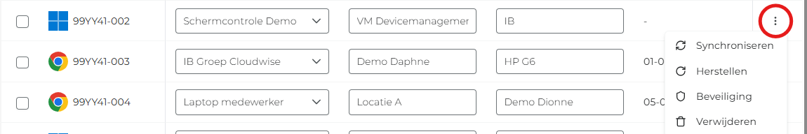 - Zoek in de lijst het apparaat dat je wil synchroniseren. Wanneer je het serienummer, de apparaatnaam of de omschrijving van het apparaat weet, kan je hier op zoeken.