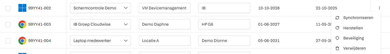 Overzicht - Zoek in de lijst het apparaat dat je wil synchroniseren. Wanneer je het serienummer, de apparaatnaam of de omschrijving van het apparaat weet, kan je hier op zoeken.