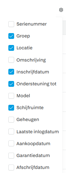 Met de knop met het tandwiel-symbool kan je kiezen welke velden je wel of niet in het overzicht wil zien. De velden naam, en serienummer zijn altijd zichtbaar.