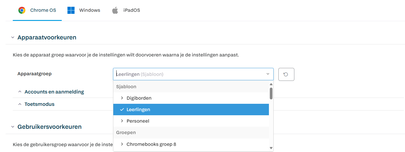 - Selecteer onder Apparaatvoorkeuren het template Leerlingen. Eventueel kan je ook een andere apparaatgroep selecteren als je voor een specifieke apparaatgroep de Facetapp beschikbaar wilt maken.