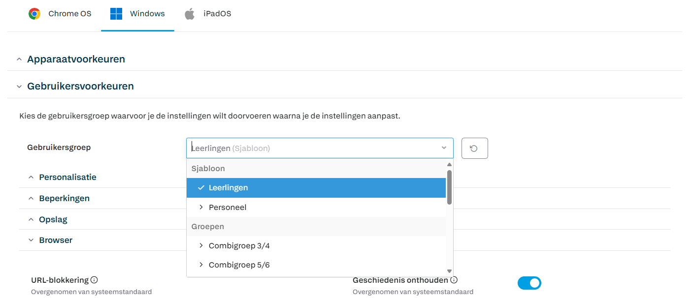 - Kies bij het dropdownmenu één van de gebruikersgroepen. De instellingen die je maakt in Gebruikersvoorkeuren gelden nu voor deze groep.