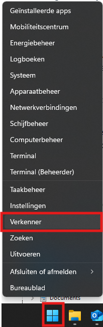 1. Open de Verkenner, dat kan bijvoorbeeld door met de rechtermuisknop op de Windows knop links onder in beeld te klikken en dan op 'Verkenner' te klikken