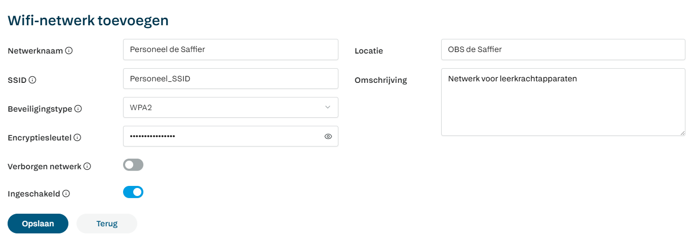 Verspreidt actief het wifi-netwerk. Staat het vinkje hier uit, dan worden de instellingen wel in Manage bewaard, maar zullen de instellingen niet naar de apparaten verspreid worden.