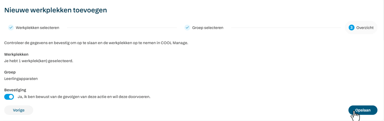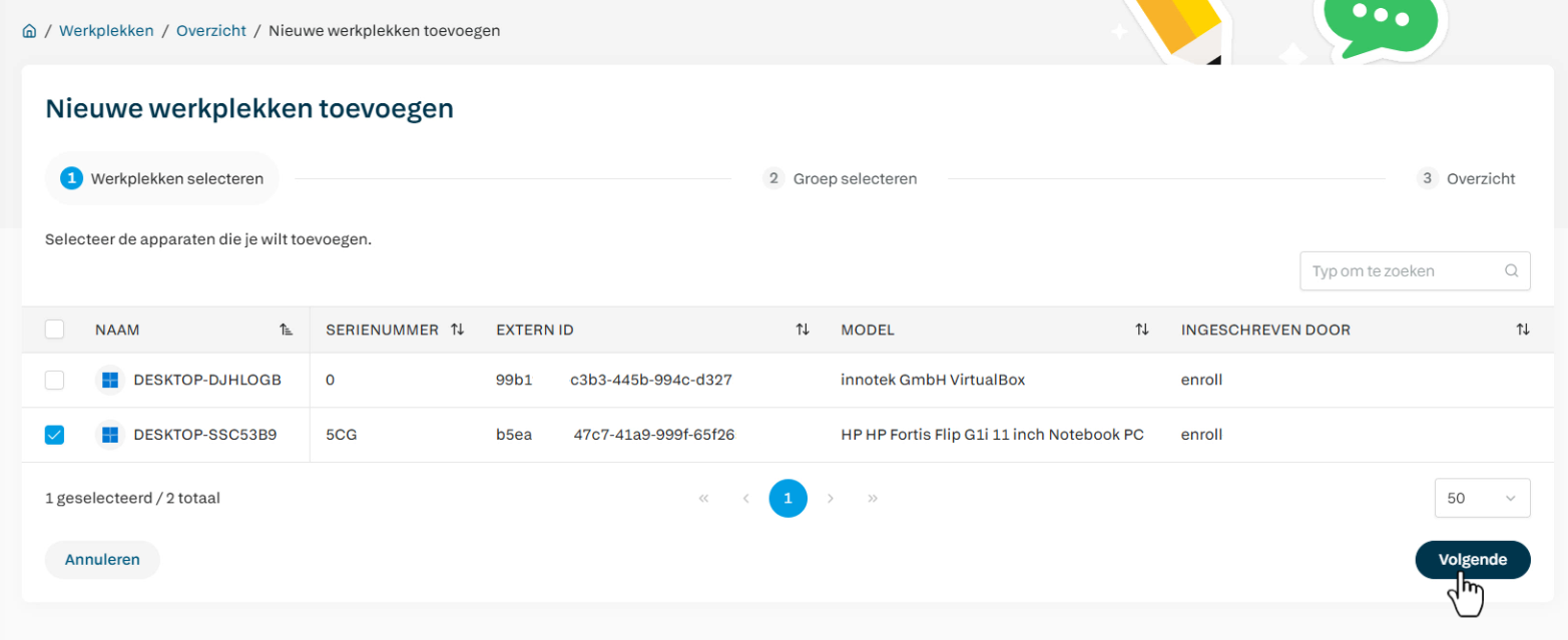 Werkplekken selecteren Selecteer de groep waaraan je de apparaten wilt toevoegen en klik op Volgende.