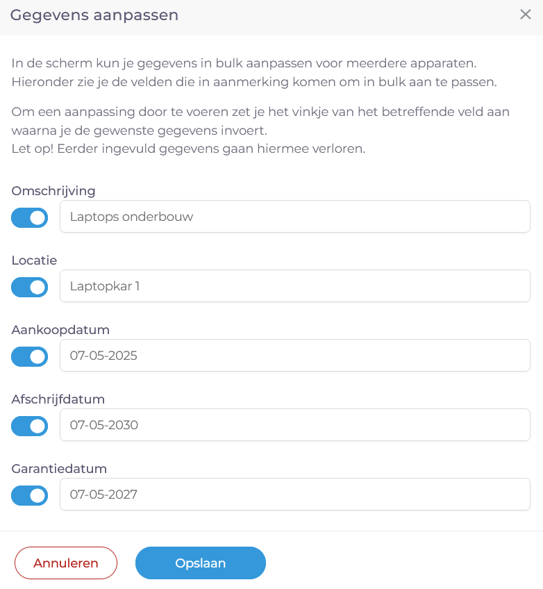 Dashboard In het Apparatenoverzicht kan je makkelijk bulkacties uitvoeren. Je kan meerdere apparaten selecteren en deze toewijzen aan een groep, herstellen of verwijderen. Helemaal nieuw is dat je nu ook in bulk gegevens kan aanpassen. Zo kan je in één keer voor meerdere apparaten een omschrijving, locatie, aankoopdatum, afschrijfdatum en garantiedatum toevoegen.