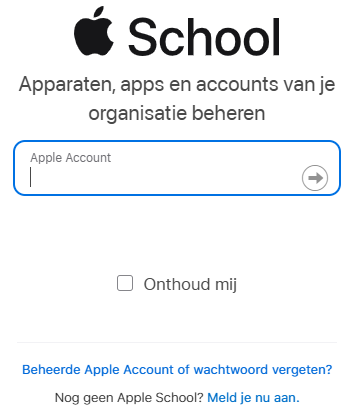 - De Apple School Manager wordt geopend. Log in met het Apple ID en wachtwoord + MFA (Multi Factor Authentication)