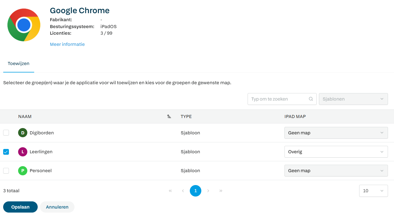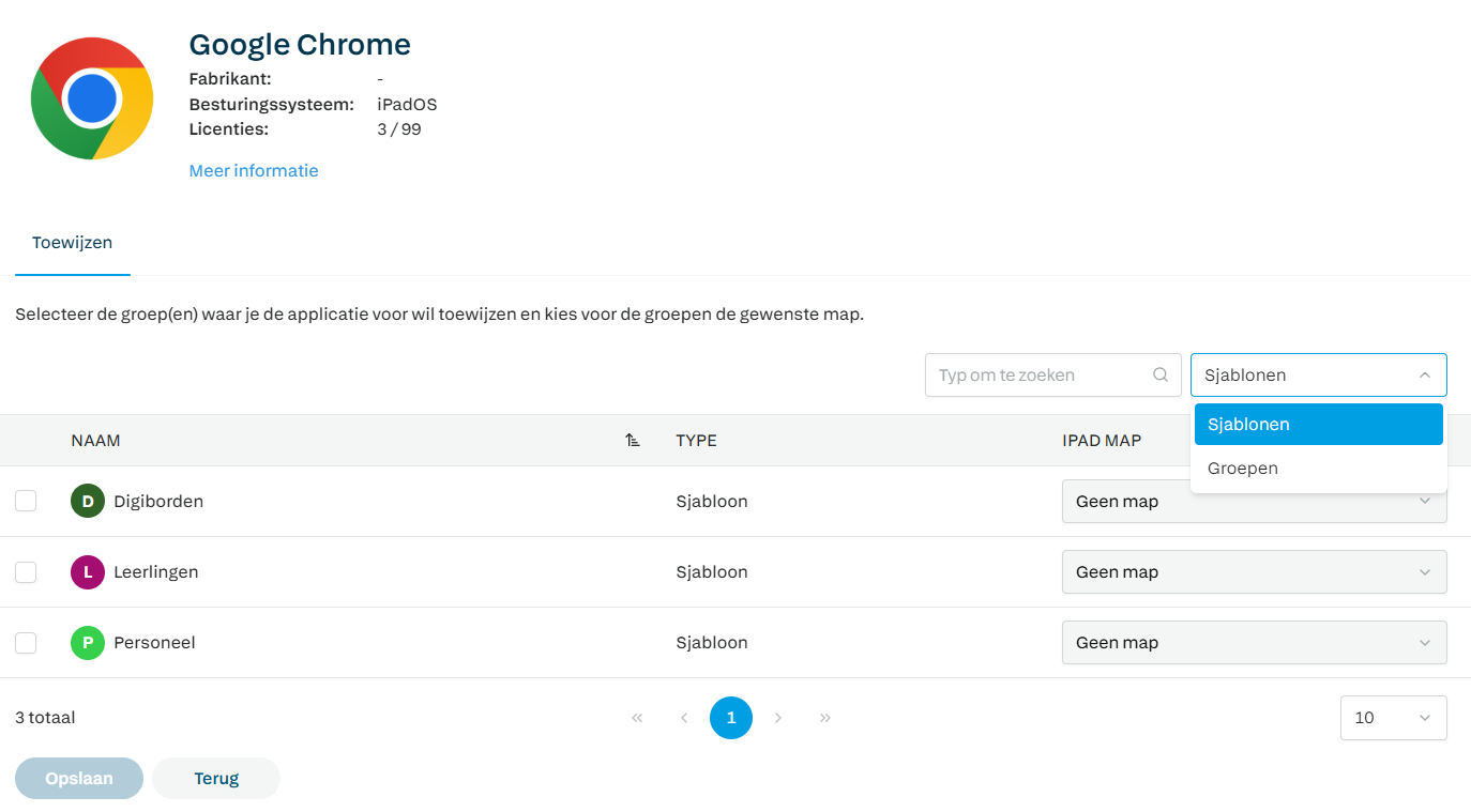 Vink de groep(en) aan waarvoor je de app wil installeren. Je kan rechtsboven kiezen voor Sjablonen of Groepen.