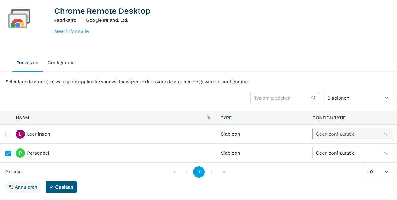 - Vink de groep(en) aan waarvoor je de app wil installeren. Je kan rechtsboven kiezen voor Sjablonen of Groepen.   - Kies Sjablonen of groepen