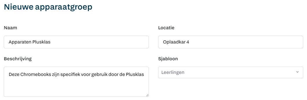 - Je kan het sjabloon van een Apparaatgroep niet wijzigen. Wil je het sjabloon wijzigen, verwijder dan de groep met de knop Verwijderen en maak een nieuwe Apparaatgroep met het juiste sjabloon.