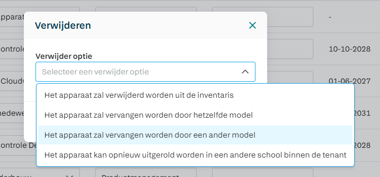 - Onderstaand scherm zal verschijnen waarbij je 4 keuzes krijgt. De keuze ‘Deze Chromebook wordt vervangen door hetzelfde model’ zal ervoor zorgen dat de licentie die is aangeschaft, behouden blijft. Als je een van de andere opties kiest, gaat de licentie verloren! Je gebruikt deze optie alleen als het apparaat ook daadwerkelijk wordt vervangen door hetzelfde model.