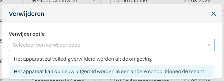 - Het apparaat kan opnieuw geïnstalleerd worden op een andere locatie in dezelfde tenant: Deze optie wordt gebruikt om het apparaat te verwijderen uit Manage van de betreffende school. Het apparaat kan vervolgens wel weer eenvoudig worden geïnstalleerd op een school van dezelfde stichting.