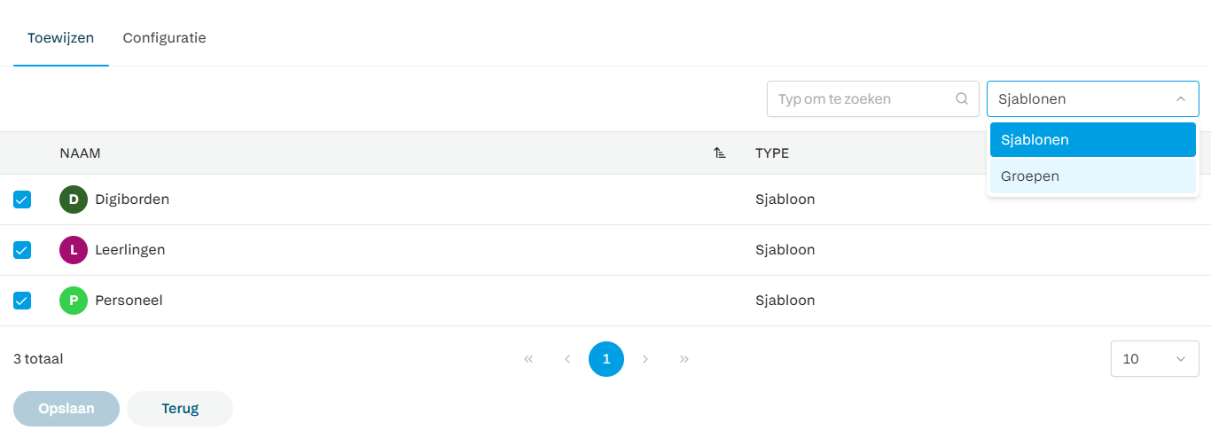 - Standaard zie je de sjablonen. Vink een sjabloon aan om toe te wijzen.