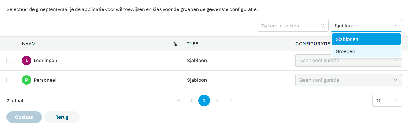 Selecteer aan welke sjablonen of groepen je de applicatie wilt toewijzen. Je wisselt tussen toewijzen aan groepen of toewijzen aan sjablonen via dit menu: