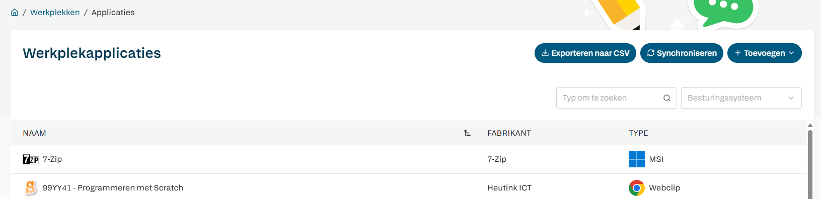 Het is vanaf nu mogelijk om een CSV-export te maken van alle toegewezen applicaties in Manage. In het werkplekapplicaties-scherm staat nu rechtsboven de knop Exporteren naar CSV.