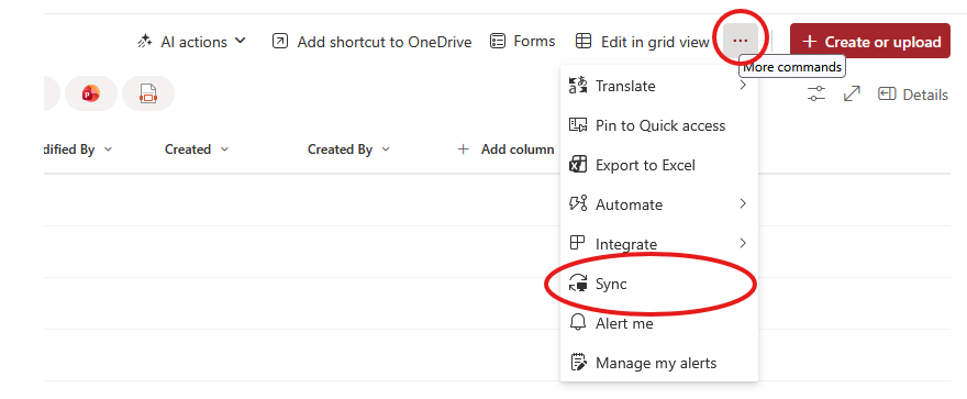 Je ziet nu een lijst met de gedeelde mappen. Klik op de drie puntjes rechtsboven en kies voor Synchroniseren.