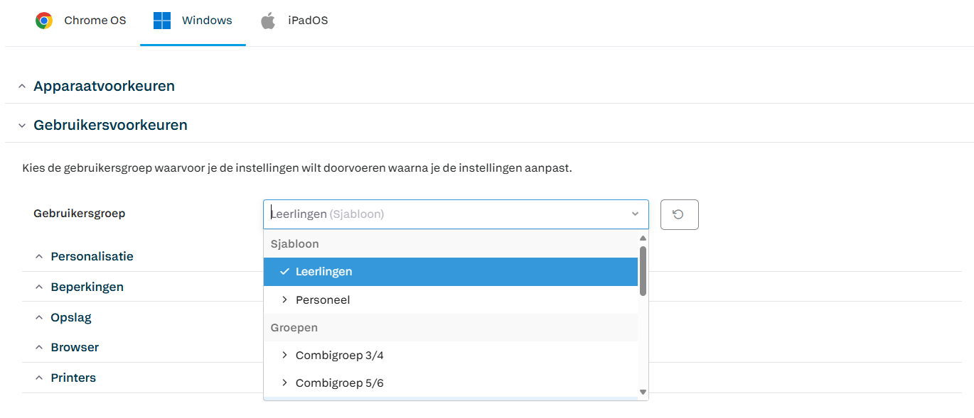 Scroll naar Gebruikersvoorkeuren en selecteer eerst in het menu voor welk sjabloon of welke gebruikersgroep je de startpagina wilt instellen.