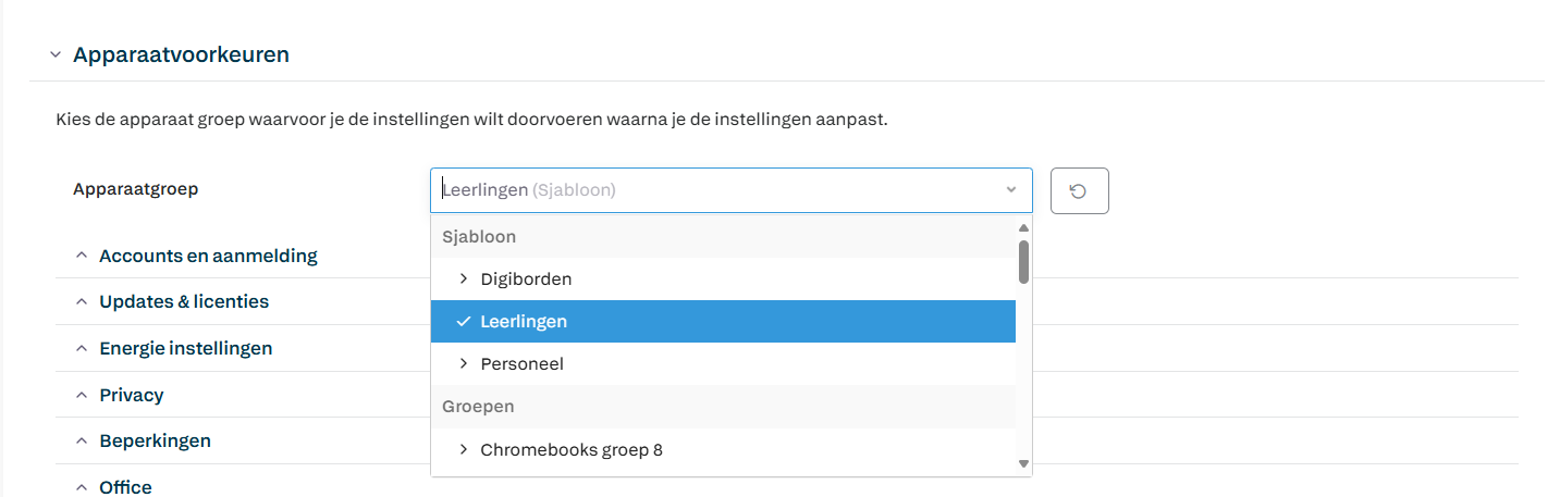 Bij Apparaatvoorkeuren; zorg dat je de juiste groep hebt geselecteerd (meestal het sjabloon Leerlingen).
